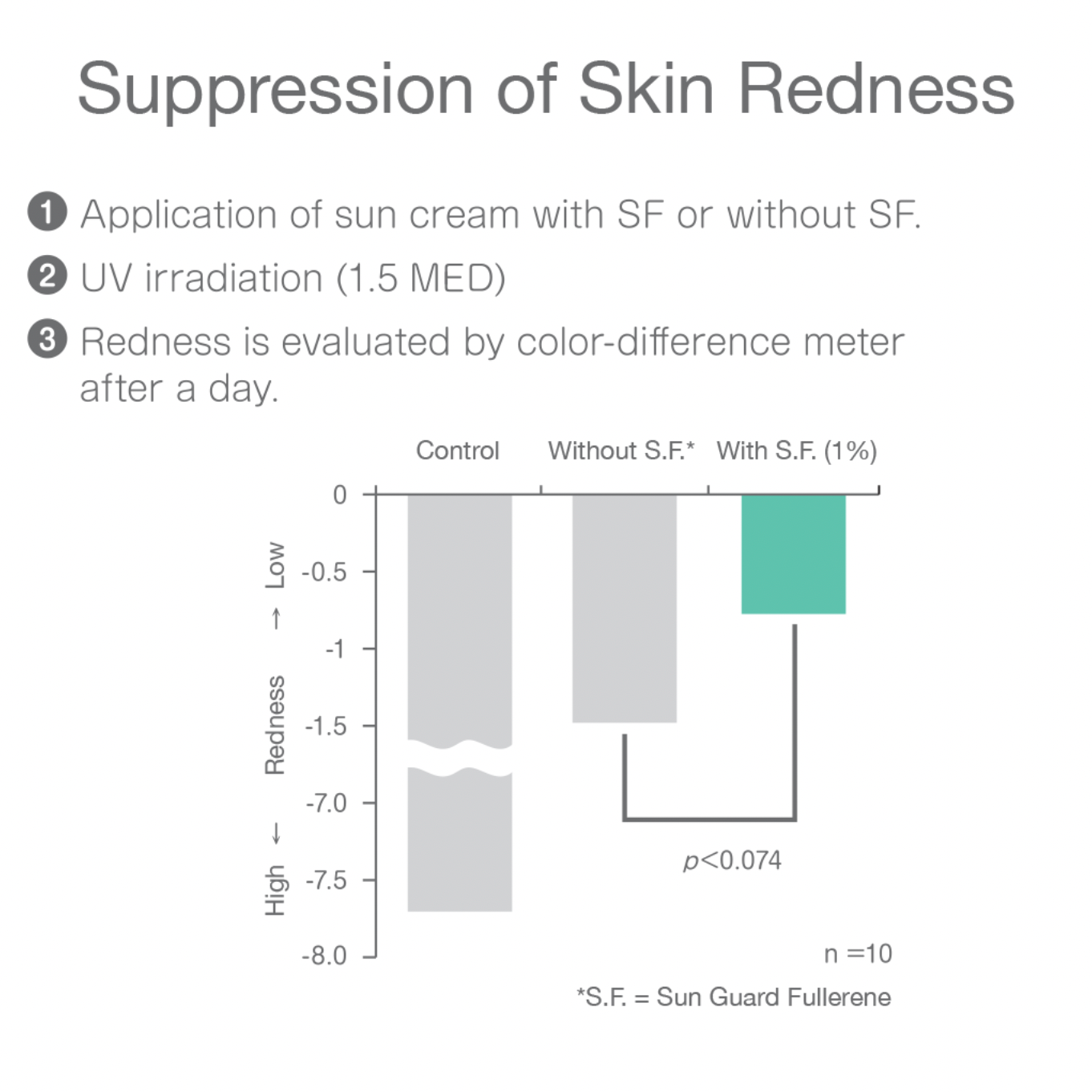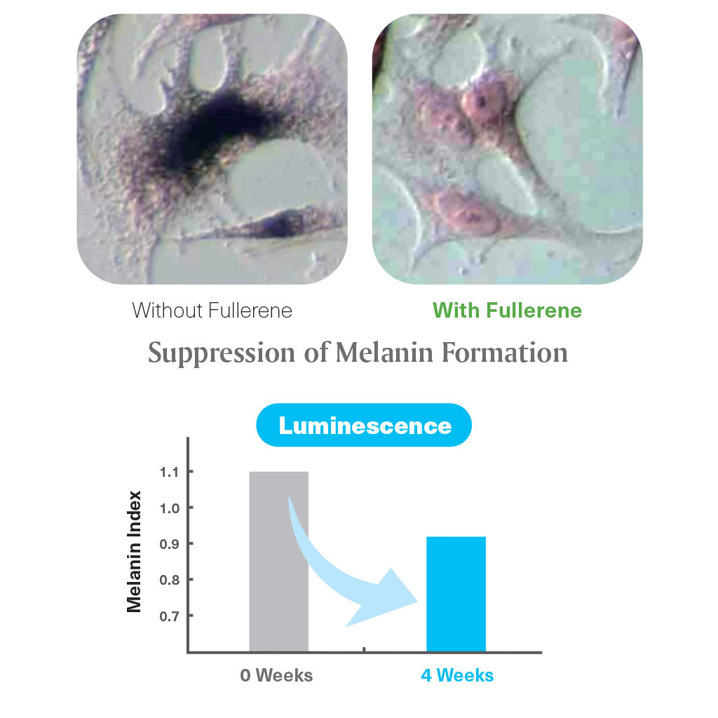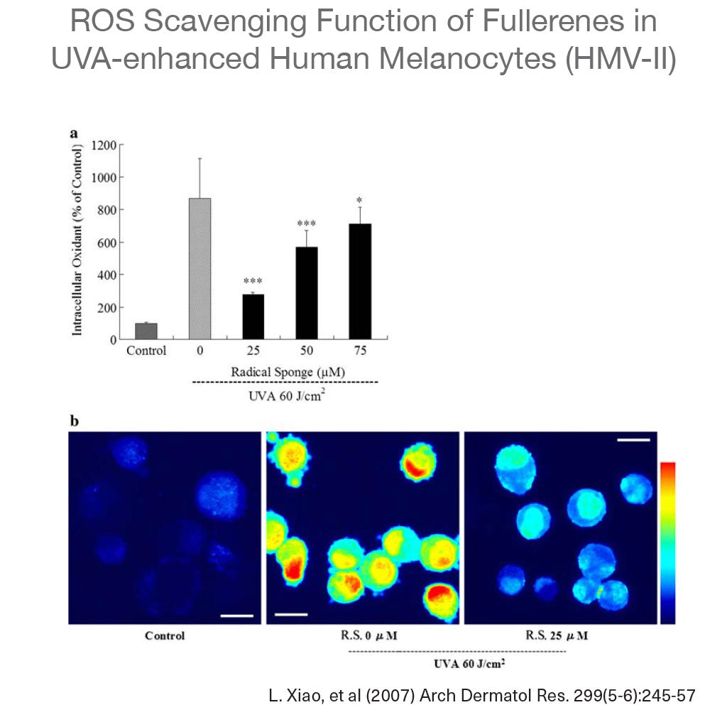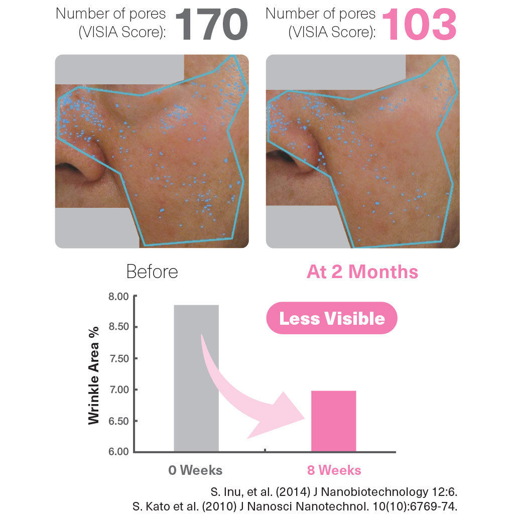 Among other things, UV exposure activates MMP9, the enzyme responsible for breaking down the skin’s lowest layer of collagen. Fullerenes interfere with that activation, as well as disrupting the destructive effect on the stratum corneum that results in shape abnormalities surrounding pores. As evidenced by clinical trial, C60 reduces wrinkle depth, tightens pores.