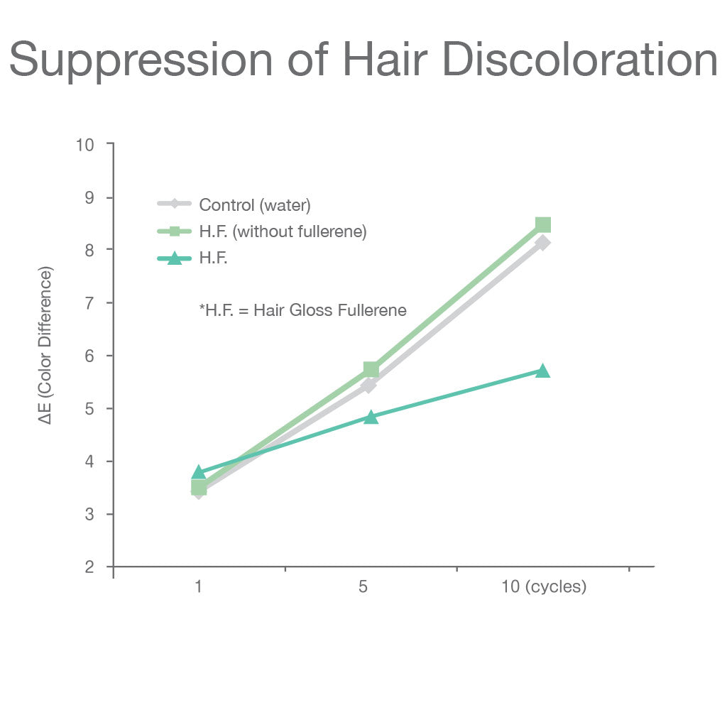 H.F. application suppresses hair dye fading, protects the cuticle, and diminishes damage due to UV exposure; lessening loss and discoloration, and protecting hair shafts.